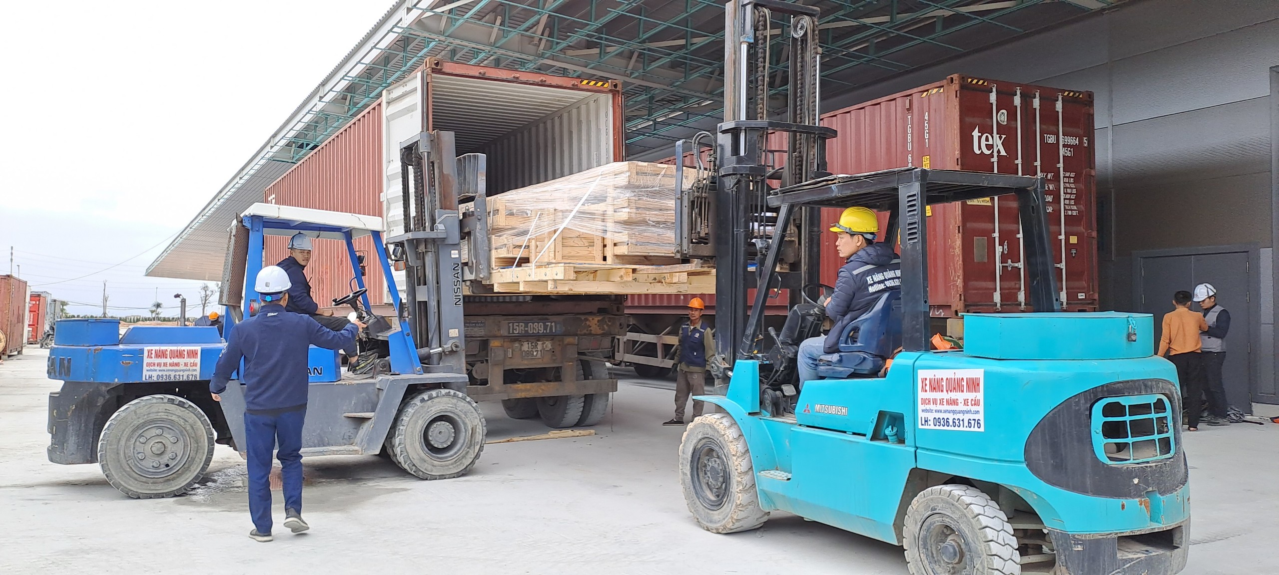 Xe nâng Quảng Ninh dỡ hàng, chuyển hàng vào trong xưởng, đưa vào vị trí theo yêu cầu